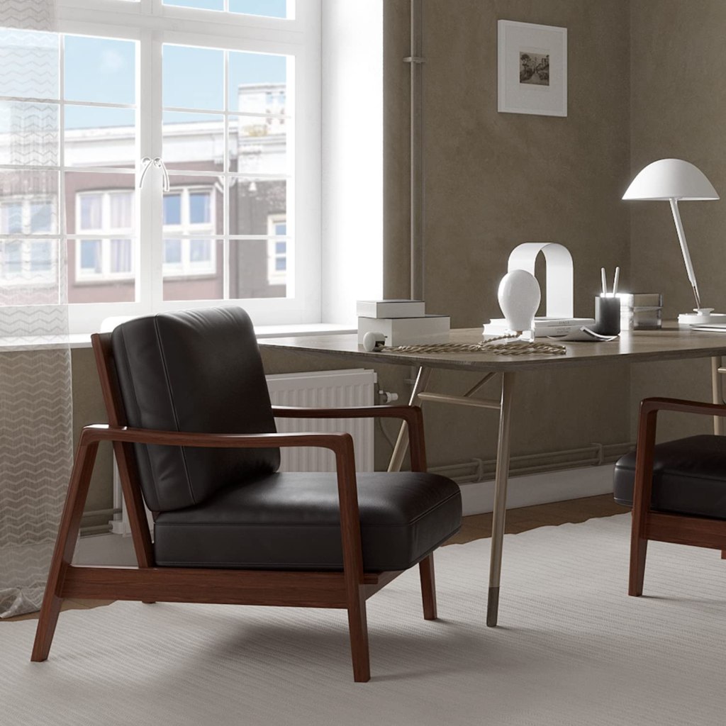 This beautiful leather accent chair has a classic black finish and a rubber-wood frame with black antique paintings that appear calm and atmospheric. The accent chair’s strong wooden structure provide a soothing space to relax.